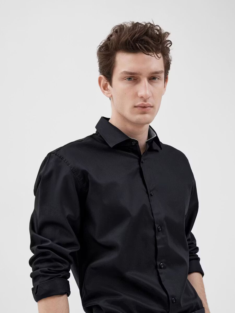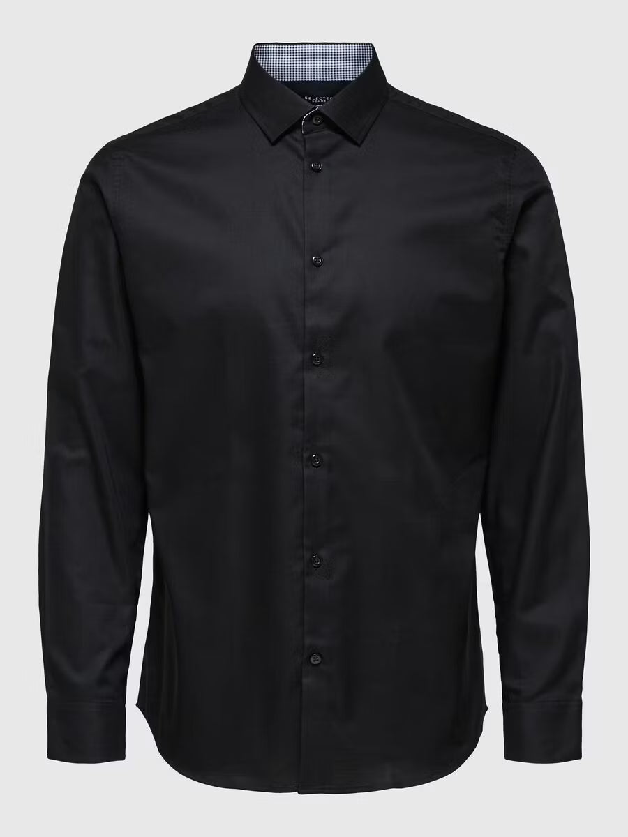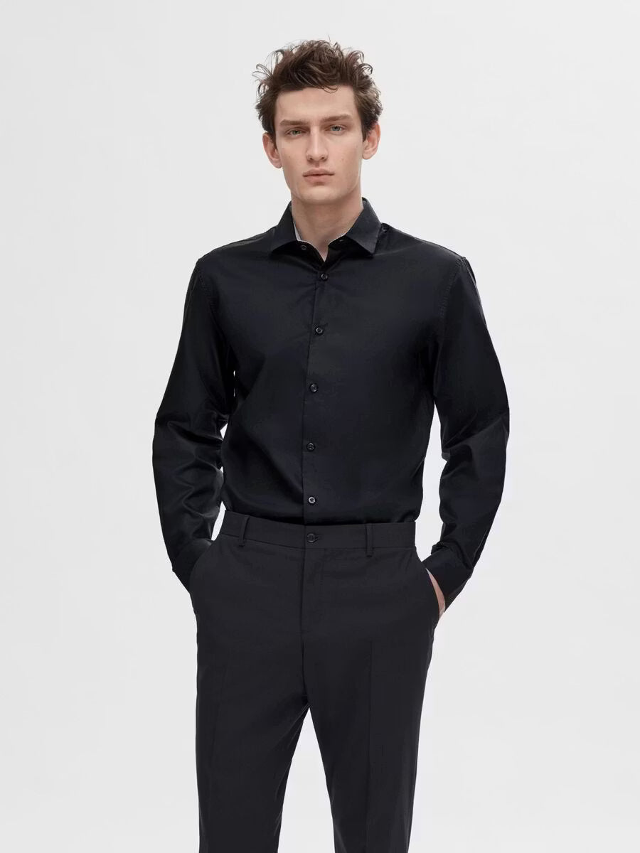 Du kan aldrig misslyckas med en klassisk skjorta. Denna är skuren i en normal passform och har långa ärmar som avslutas med manschetter med knappar. Den är längre än en standardskjorta, vilket gör det extra bekvämt när du stoppar ner den i dina byxor. Den är också gjord av ekologisk bomull, vilket gör den till ett mer miljövänligt val. Vi föreslår att du stylar den med en av våra enkelknäppta kavajer och matchande byxor.